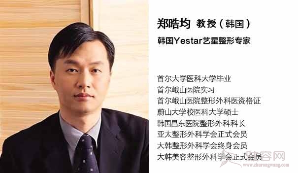 郑皓均,Yestar艺星(武汉)整形美容整形外科院长,毕业于首尔大学医科大学,蔚山医科大学完成硕士学业,首尔峨山医院整形外科取得专门医资格证。历任首尔整形外科医院院长,韩国QUEEN整形医院院长,韩国知美整形医院院长,其娴熟的整形技巧,精致的整形效果得到了广泛的称颂,是韩国面部整形外科协会主任员,PARW国际美容协会正式会员。