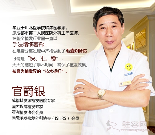 简介:1981年3月毕业于川北医学院临床医学系。原成都市第二人民医院外科主治医师。拥有良好的医德医风。他在整个植发行业里一直以手法精细著称,这也确保了他在毛囊分离过程中严格做到了对毛囊的0损伤,可谓是“快、准、稳”,大大的缩短了手术时间,确保了植发效果。被誉为植发界的“技术标杆”。曾在国内、外医学杂志发表过一系列关于毛发移植的文章,从事毛发研究工作的10余年里,总结出了一套系统的诊断、治疗体系。参编和主编专著10余部。